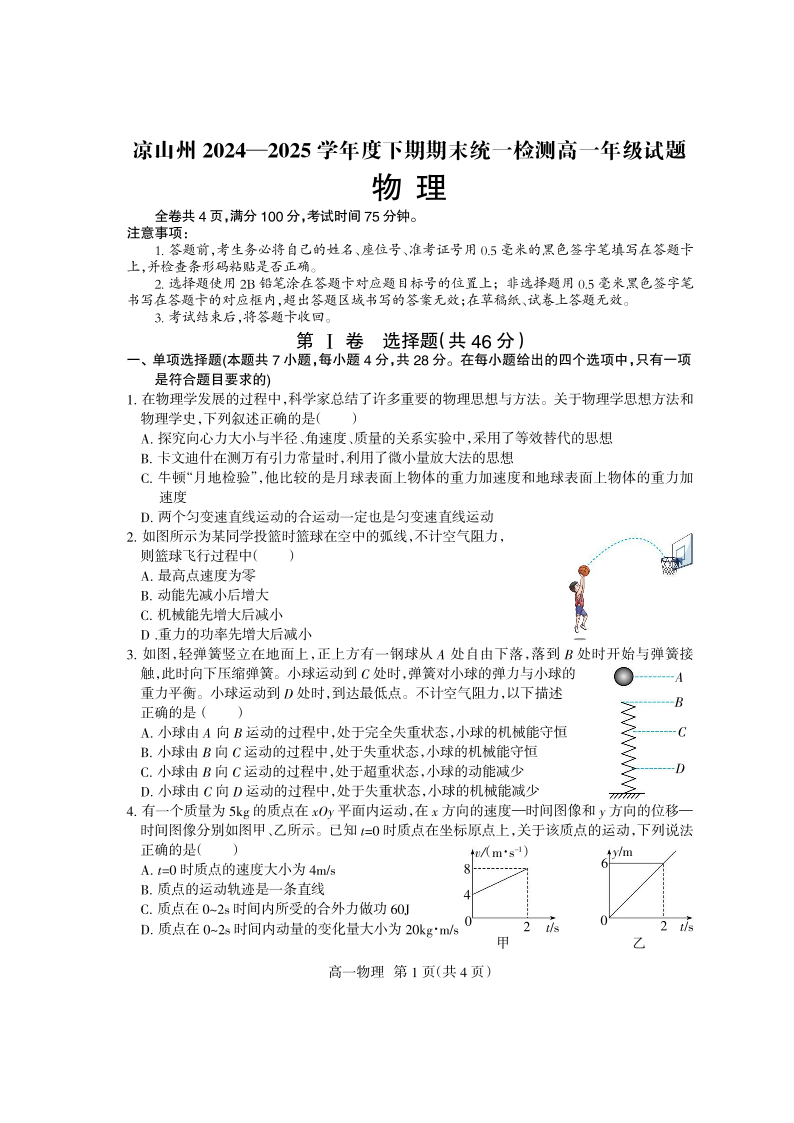 高一物理--四川省凉山州2024-2025学年高一下学期期末考试