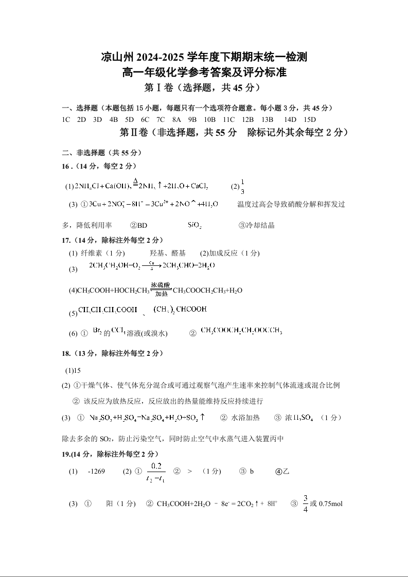高一化学答案--四川省凉山州2024-2025学年高一下学期期末考试