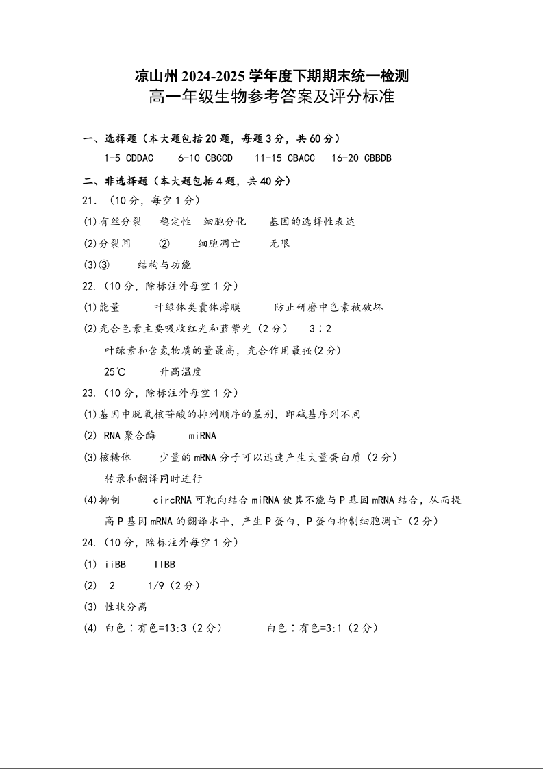 高一生物学答案--四川省凉山州2024-2025学年高一下学期期末考试