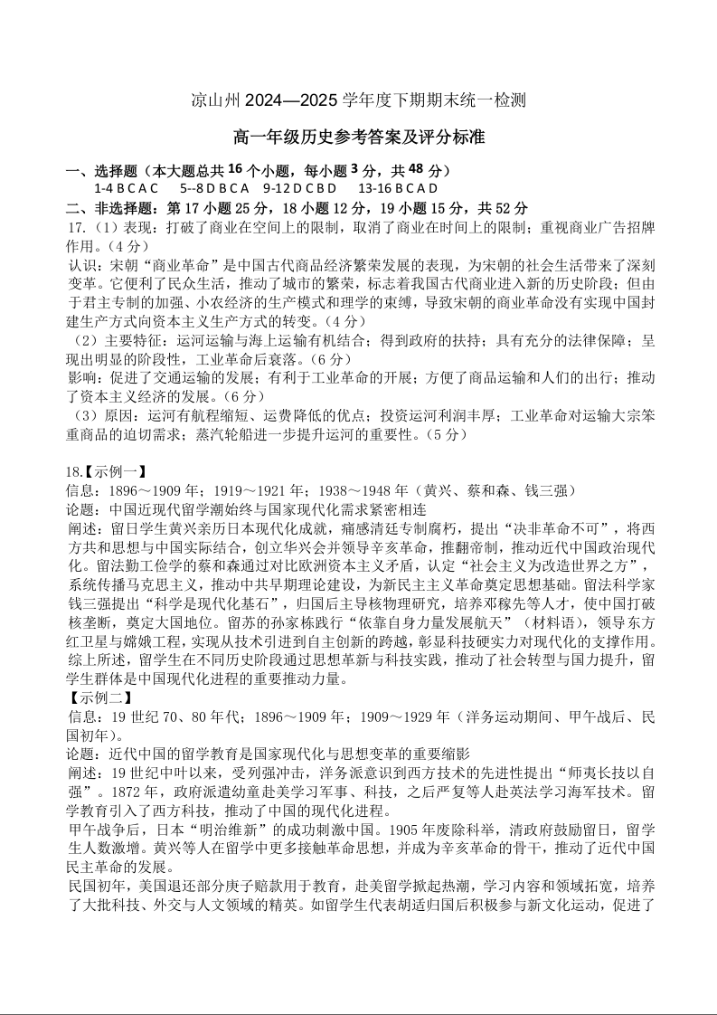 高一历史答案--四川省凉山州2024-2025学年高一下学期期末考试