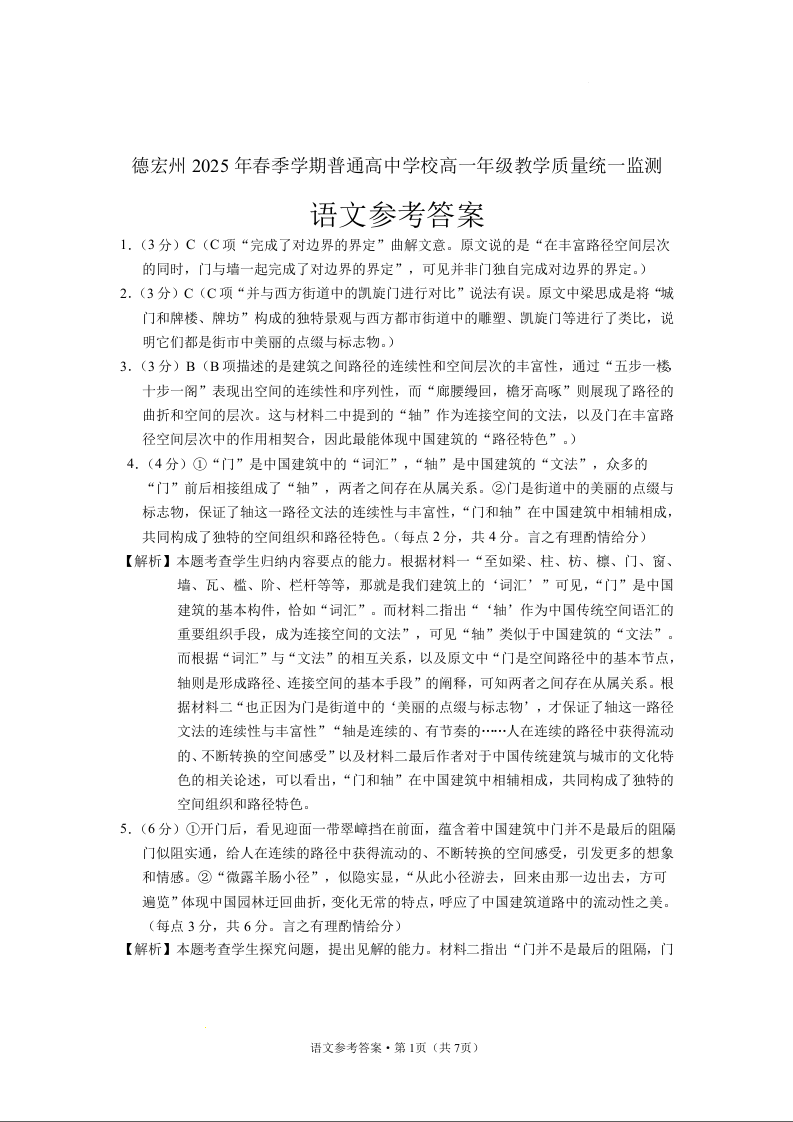 高一语文答案--云南省德宏州2024-2025学年高一下学期期末考试