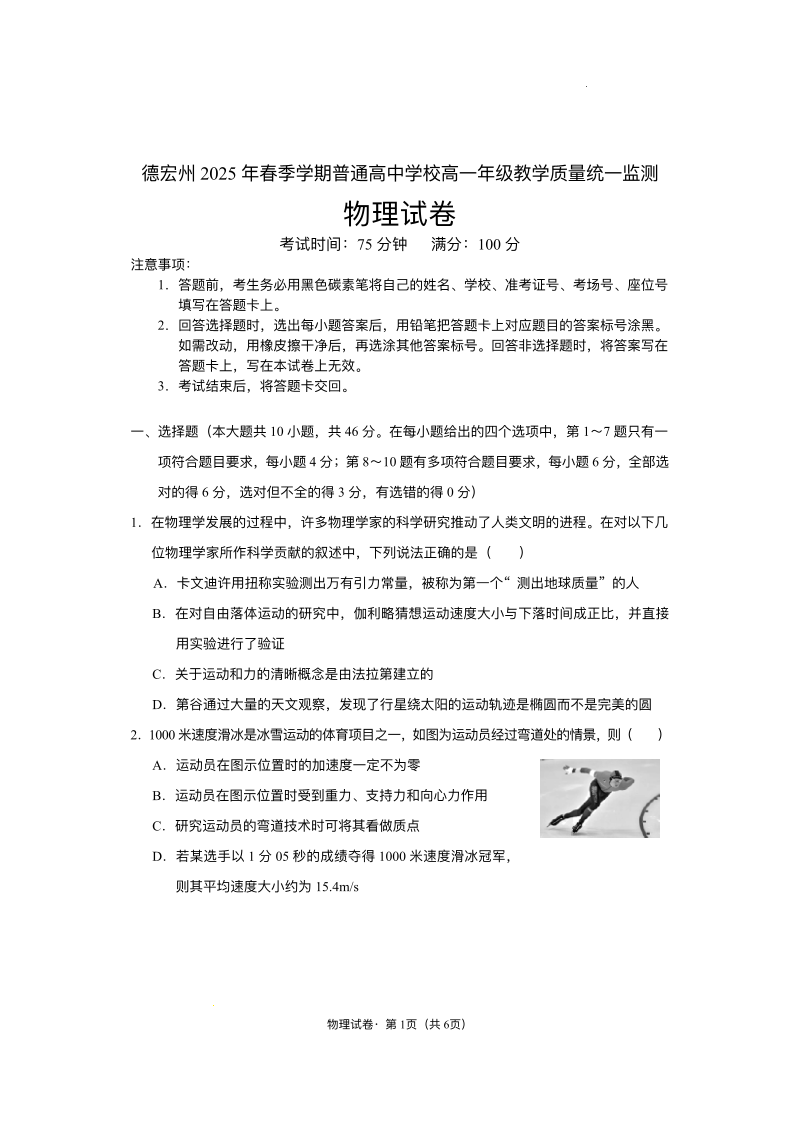 高一物理+答案--云南省德宏州2024-2025学年高一下学期期末考试
