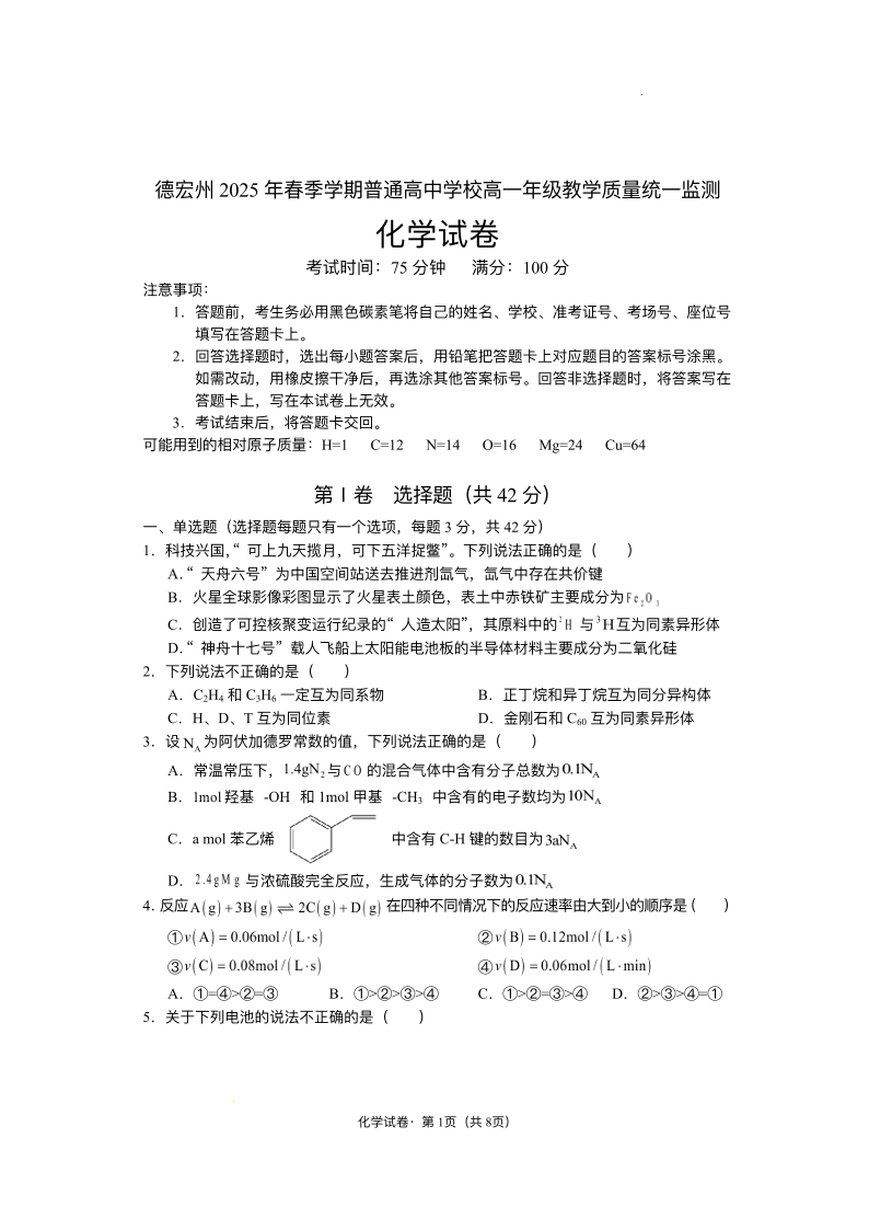高一化学+答案--云南省德宏州2024-2025学年高一下学期期末考试