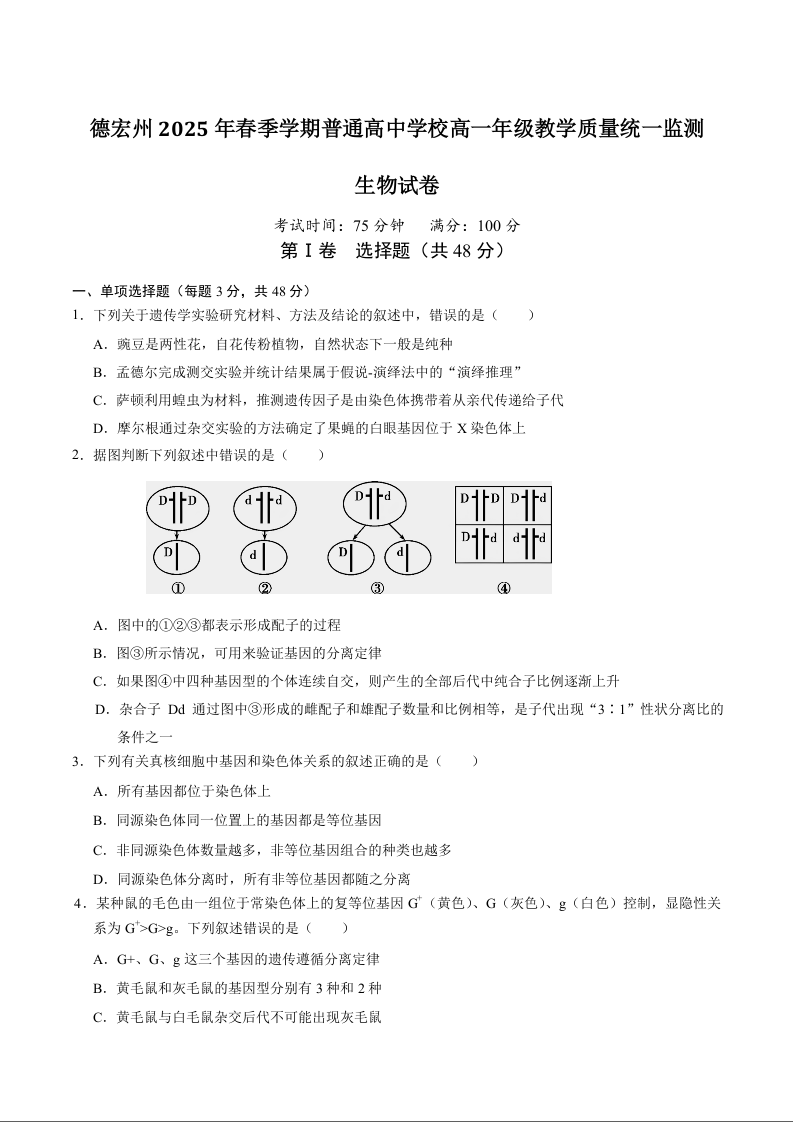 高一生物+答案--云南省德宏州2024-2025学年高一下学期期末考试