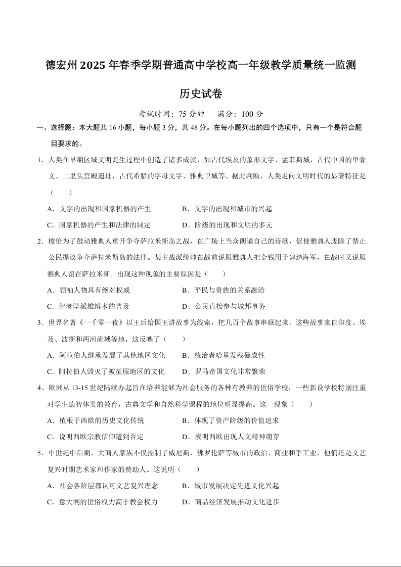 高一历史+答案--云南省德宏州2024-2025学年高一下学期期末考试