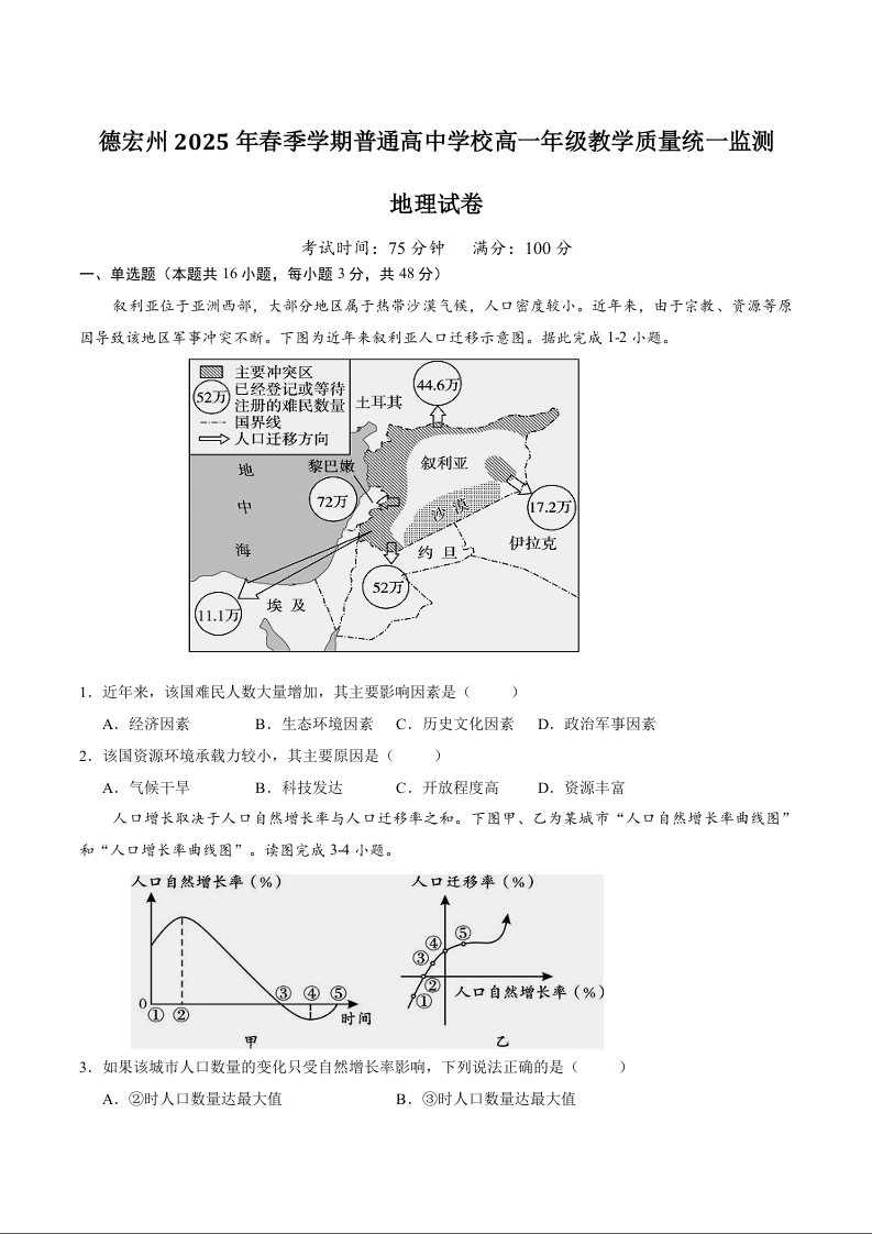 高一地理+答案--云南省德宏州2024-2025学年高一下学期期末考试