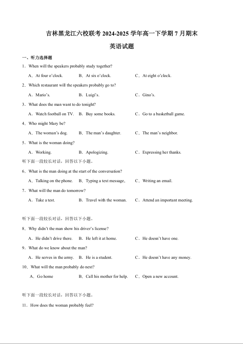 高一英语+答案--吉林省、黑龙江省六校联考2024-2025学年高一下学期7月期末考试