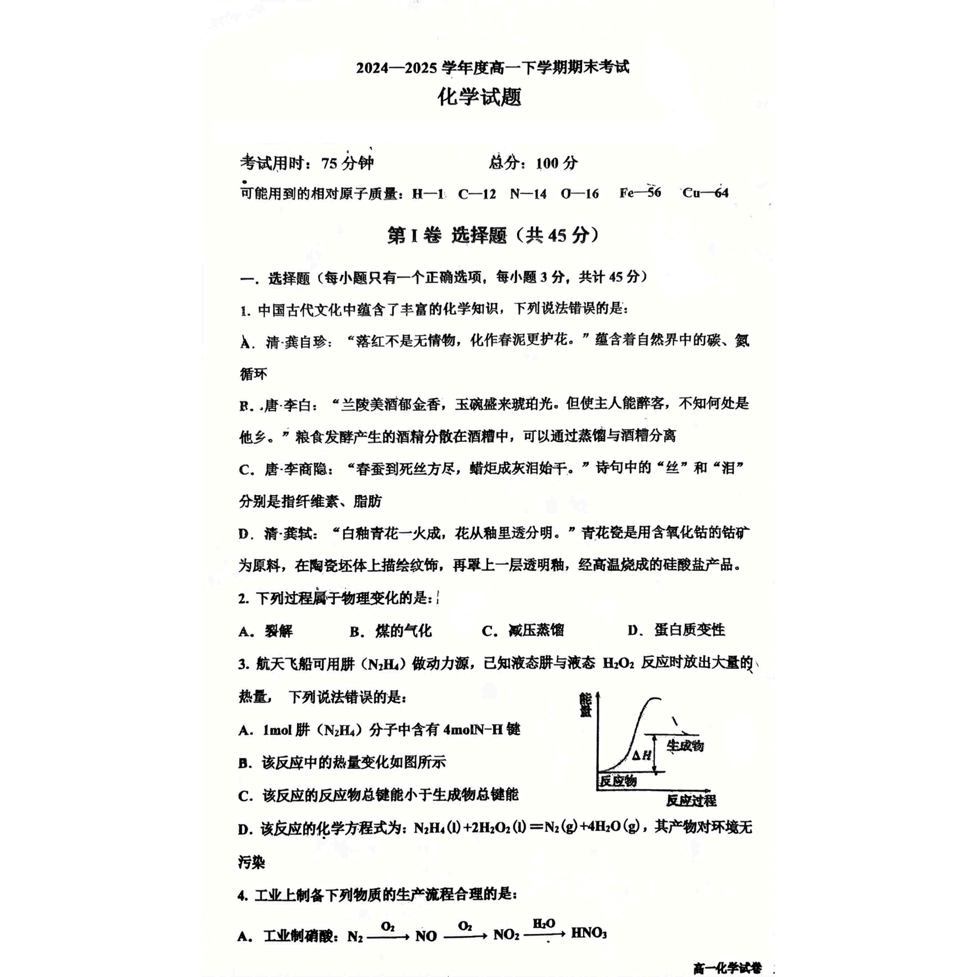 高一化学+答案--吉林省、黑龙江省六校联考2024-2025学年高一下学期7月期末考试