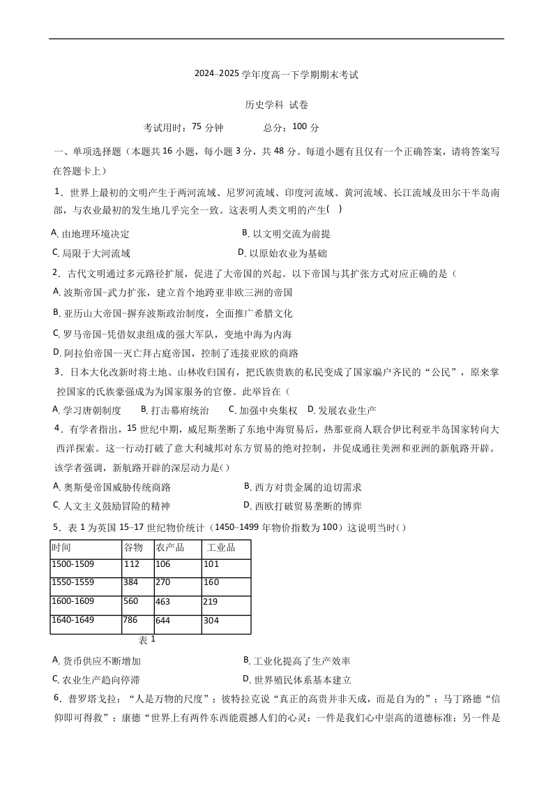 高一历史+答案--吉林省、黑龙江省六校联考2024-2025学年高一下学期7月期末考试
