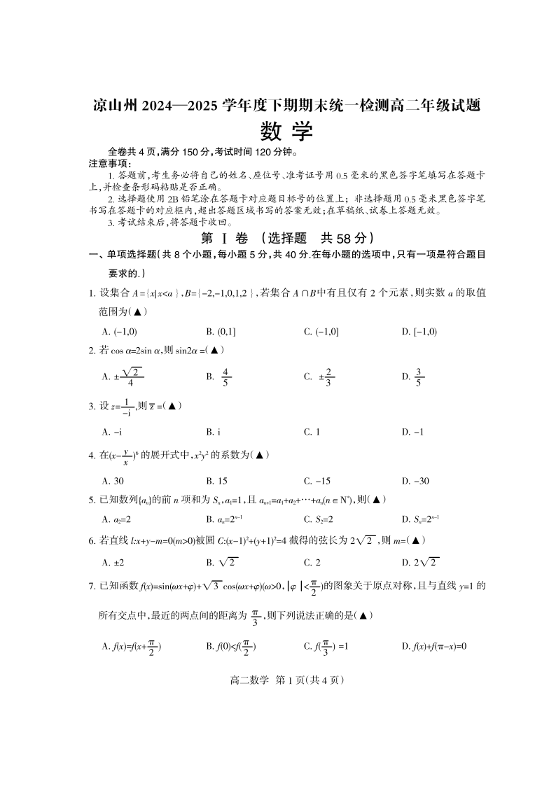 高二数学--四川省凉山州2024-2025学年高二下学期期末考试