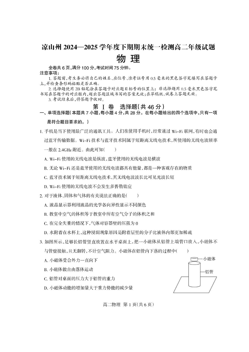 高二物理+答案----四川省凉山州2024-2025学年高二下学期期末考试
