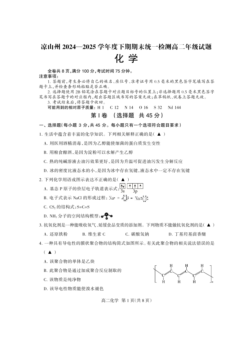 高二化学--四川省凉山州2024-2025学年高二下学期期末考试