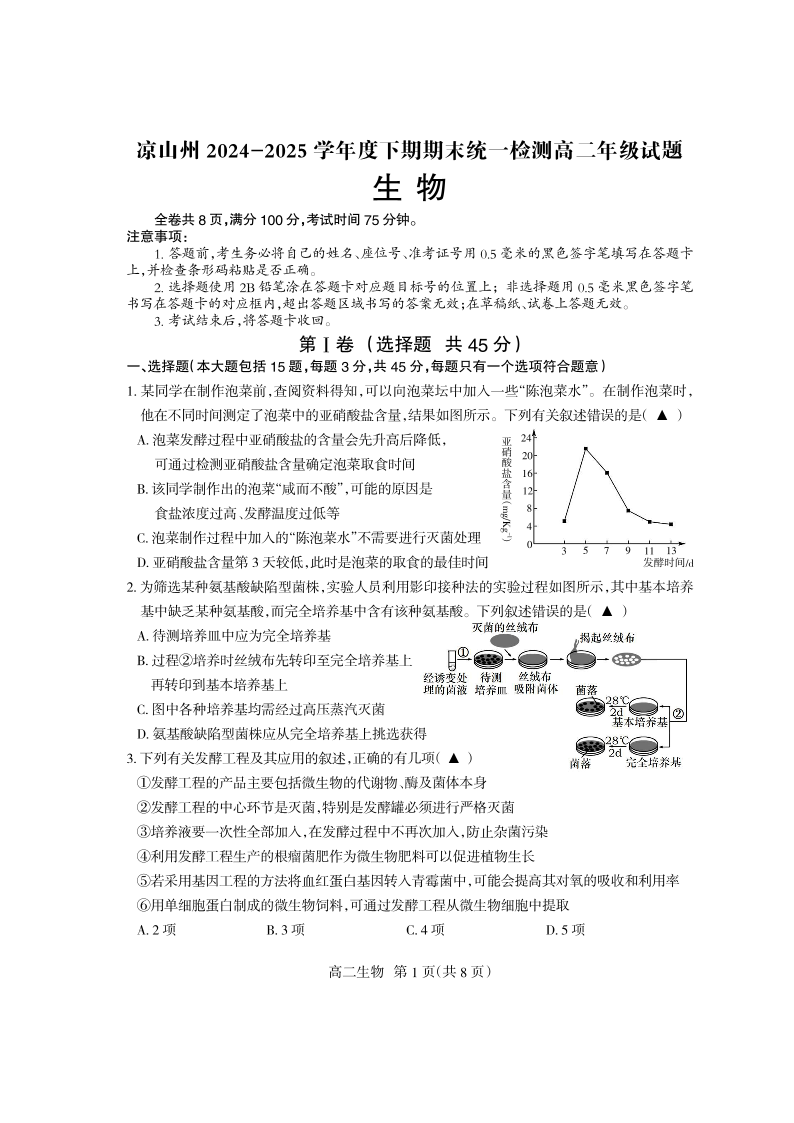 高二生物学--四川省凉山州2024-2025学年高二下学期期末考试