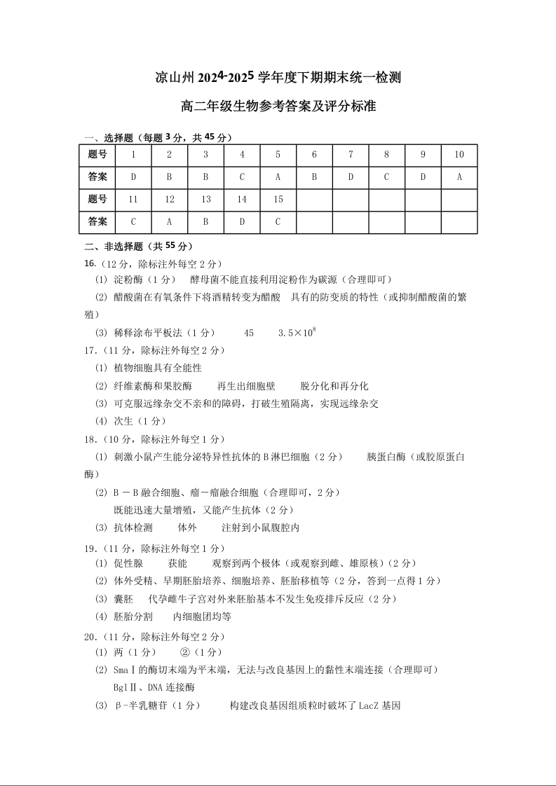 高二生物学答案--四川省凉山州2024-2025学年高二下学期期末考试