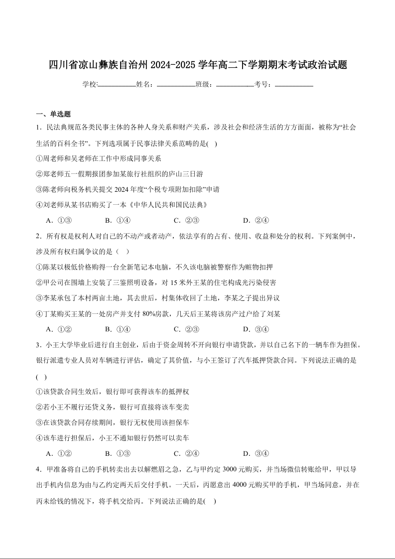 高二政治+答案----四川省凉山州2024-2025学年高二下学期期末考试