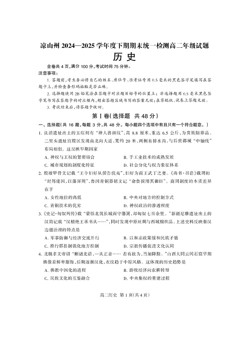 高二历史+答案----四川省凉山州2024-2025学年高二下学期期末考试