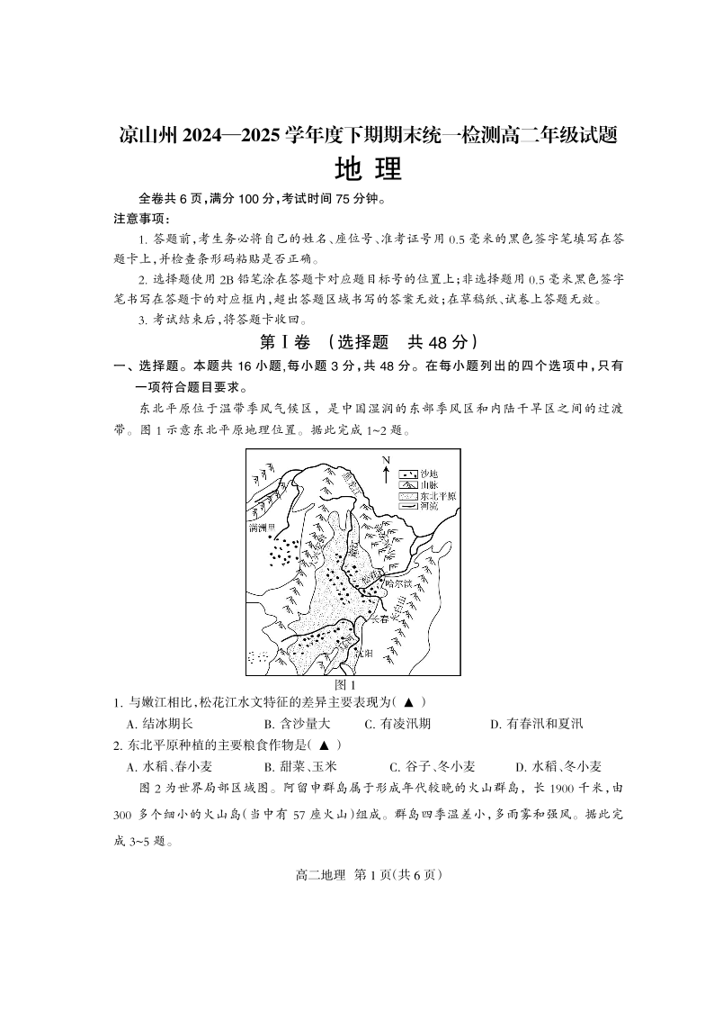 高二地理--四川省凉山州2024-2025学年高二下学期期末考试