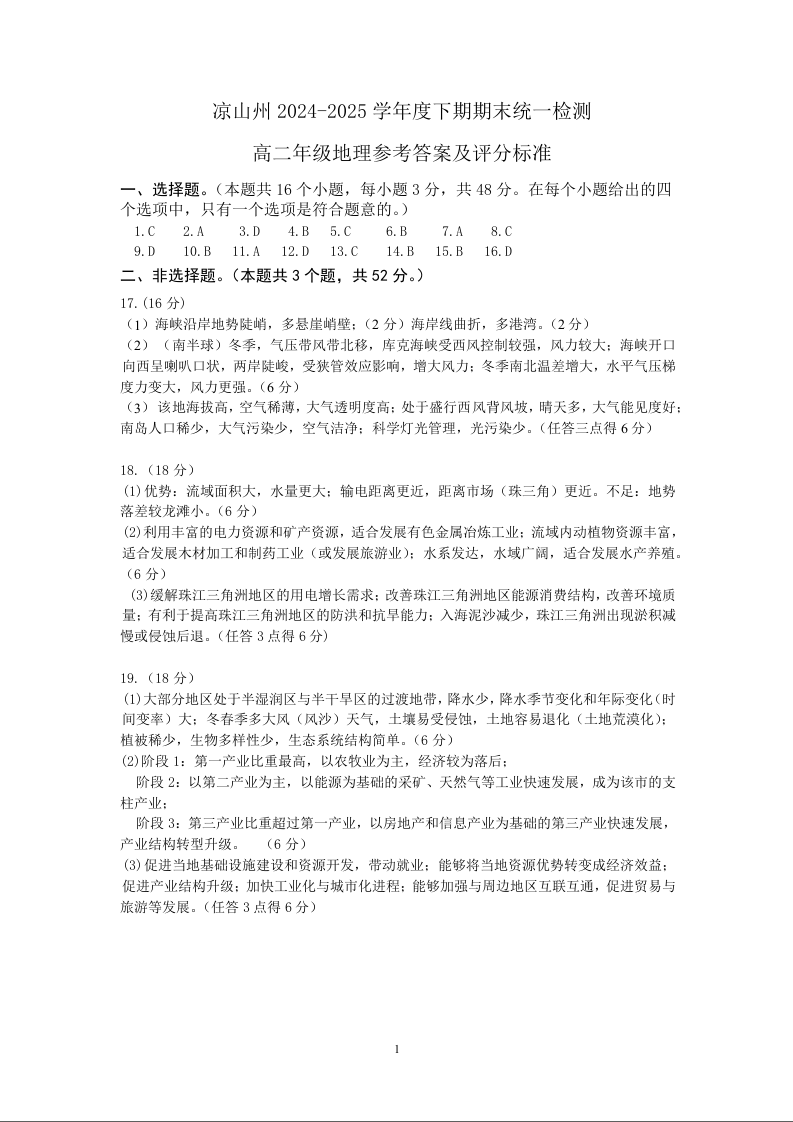 高二地理答案--四川省凉山州2024-2025学年高二下学期期末考试