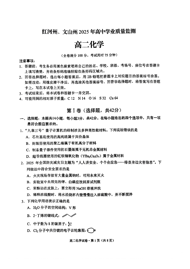高二化学+答案--云南省红河州、文山州2024-2025学年高二下学期期末考试