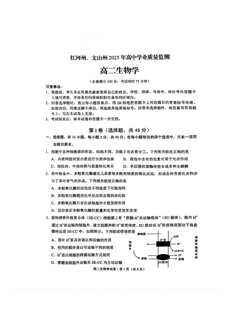 高二生物+答案--云南省红河州、文山州2024-2025学年高二下学期期末考试