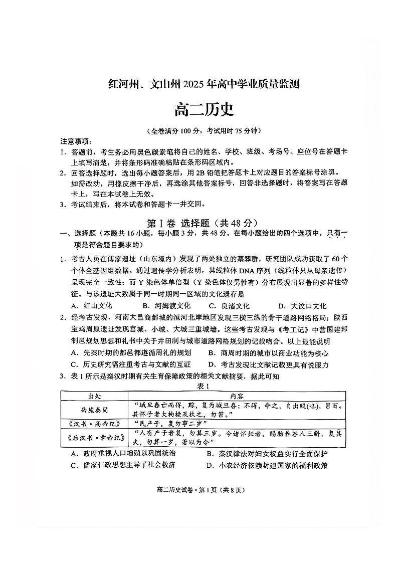 高二历史+答案--云南省红河州、文山州2024-2025学年高二下学期期末考试