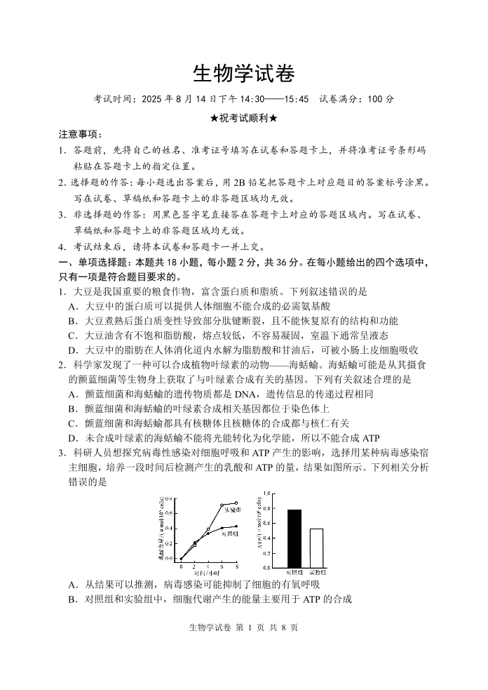 高三生物--湖北省腾云联盟2026届高三上学期开学考试