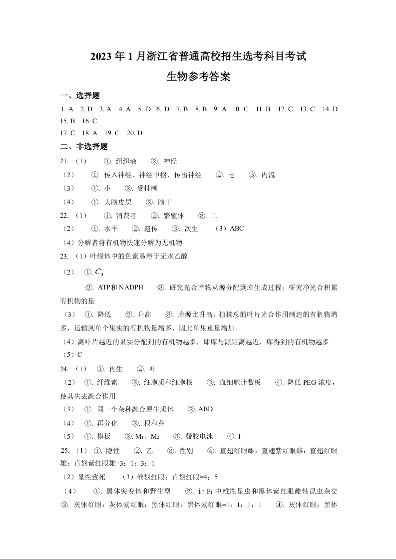 高三生物答案--浙江省2023年1月普通高校招生选考