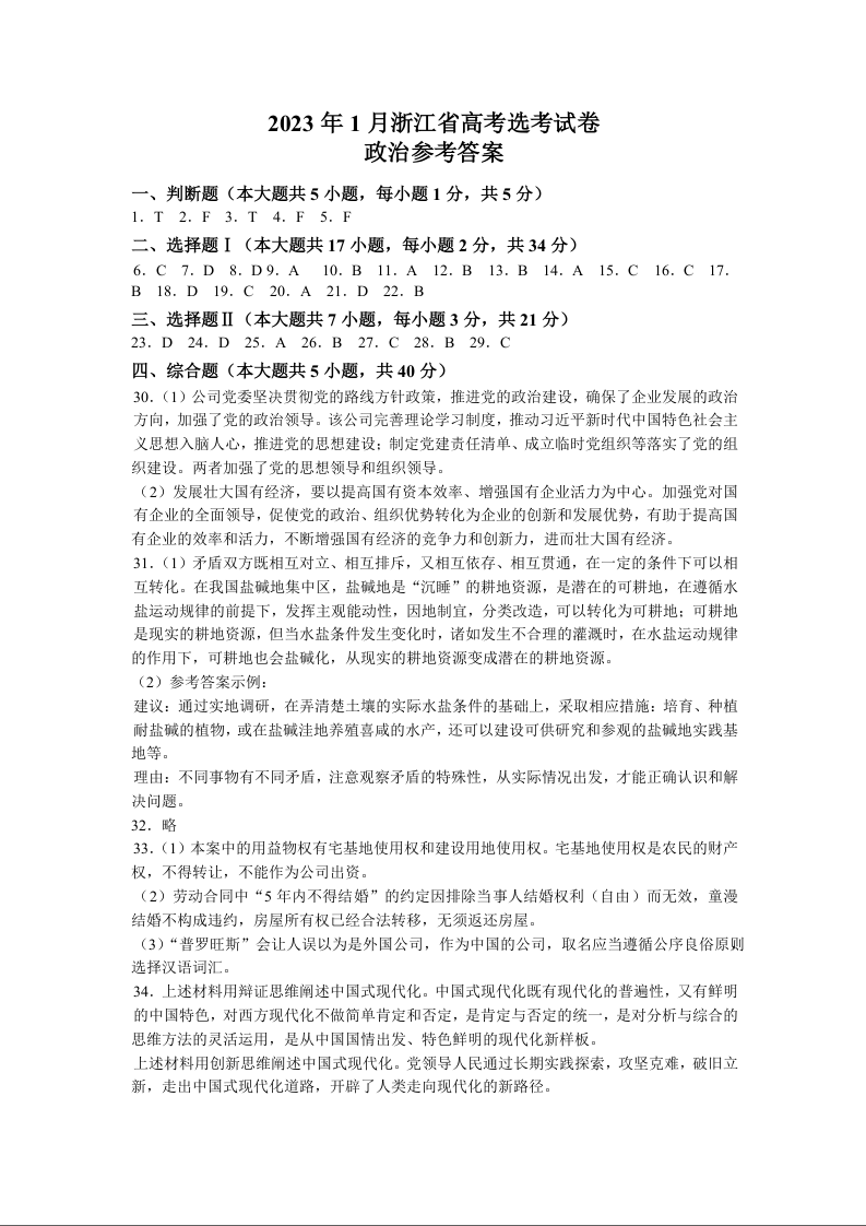 高三政治答案--浙江省2023年1月普通高校招生选考