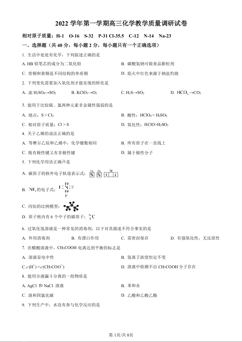 高三化学--上海市长宁区2023届高三上学期教学质量调研(一模)