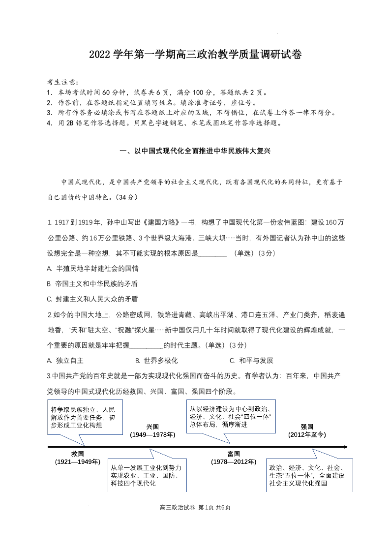 高三政治--上海市长宁区2023届高三上学期教学质量调研(一模)