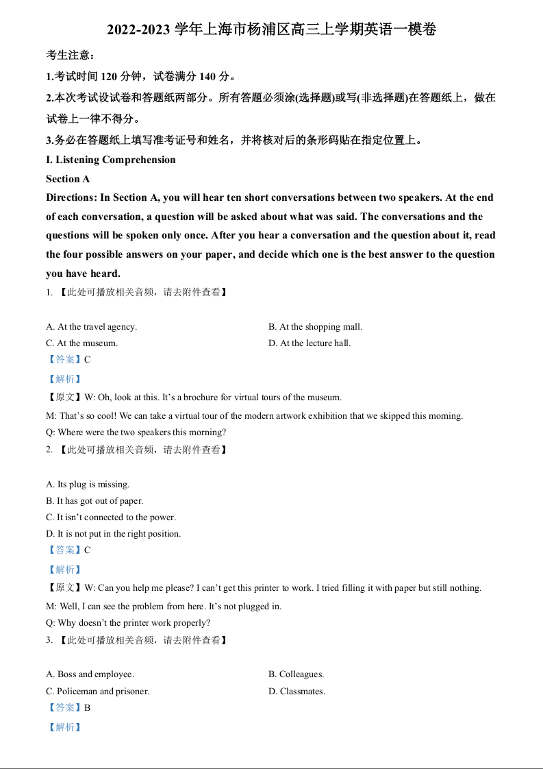 高三英语(解析版)--上海市杨浦区2023届高三上学期一模