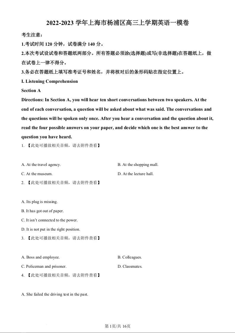 高三英语(原卷版)--上海市杨浦区2023届高三上学期一模