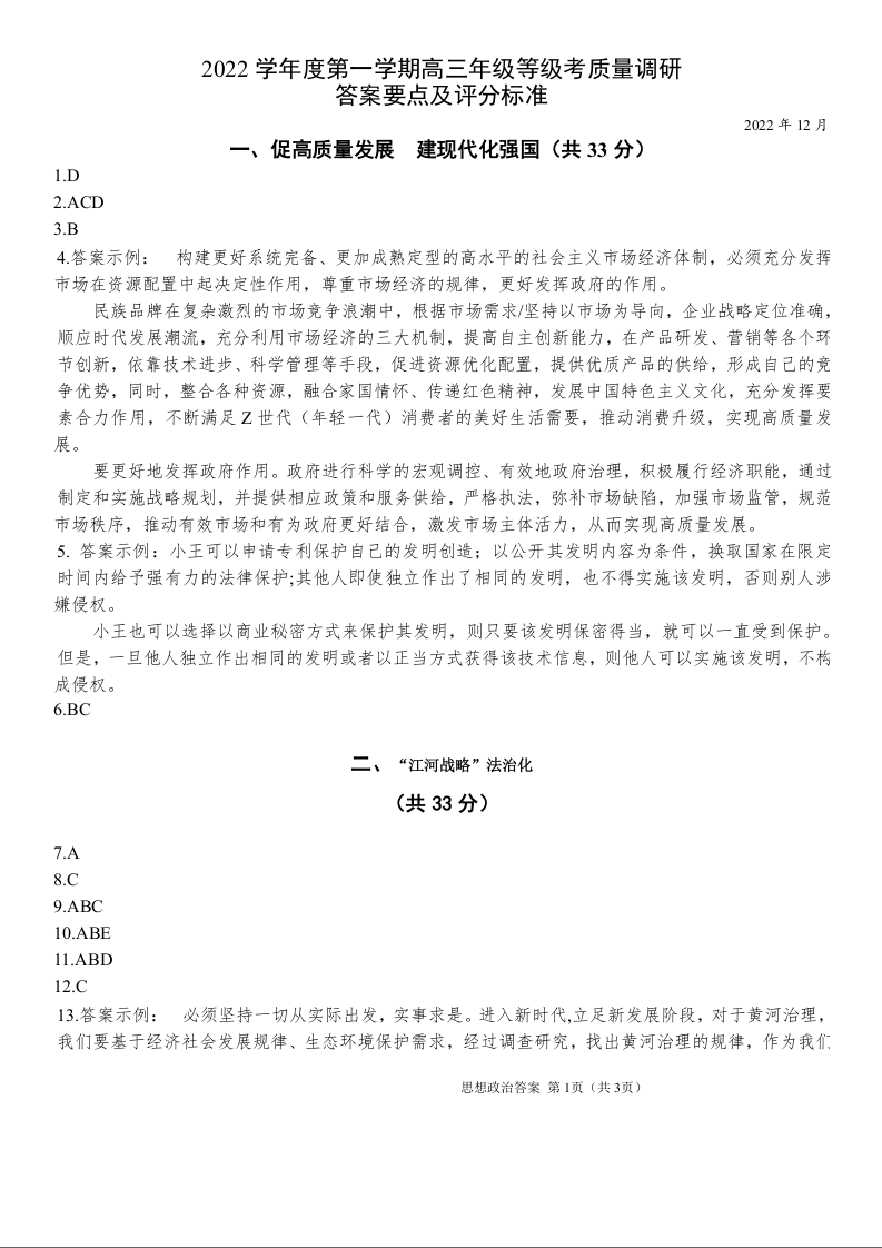 高三政治答案--上海市杨浦区2023届高三上学期一模