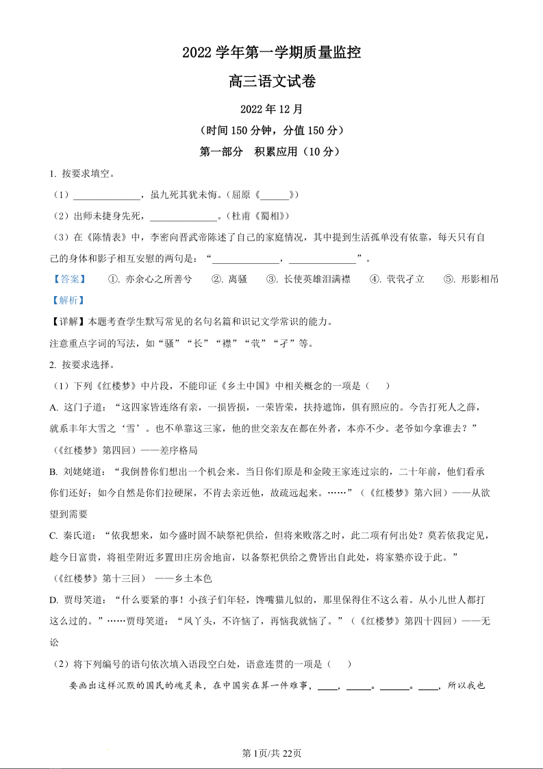 高三语文(解析版)--上海市金山区2023届高三上学期期末(暨一模)质量监控
