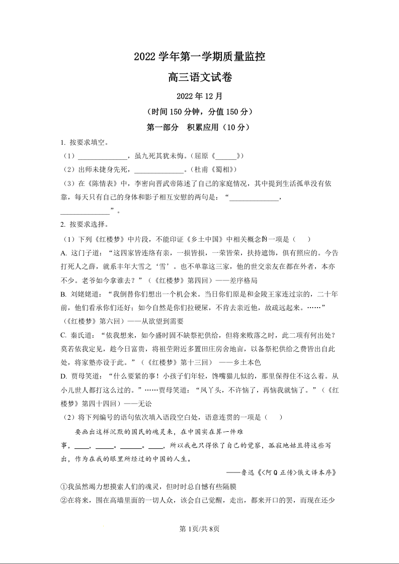 高三语文(原卷版)--上海市金山区2023届高三上学期期末(暨一模)质量监控