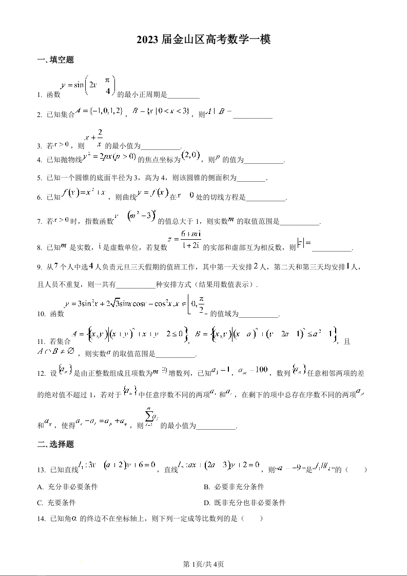 高三数学(原卷版)--上海市金山区2023届高三上学期期末(暨一模)质量监控