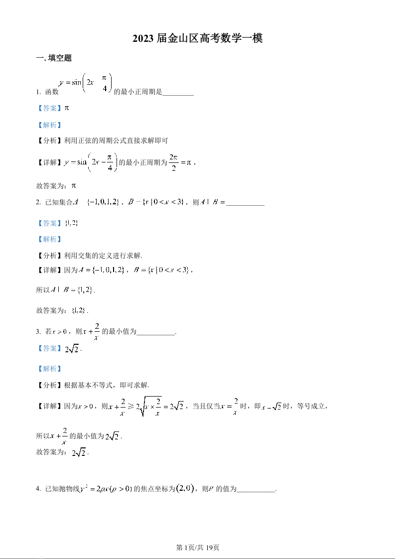 高三数学(解析版)--上海市金山区2023届高三上学期期末(暨一模)质量监控
