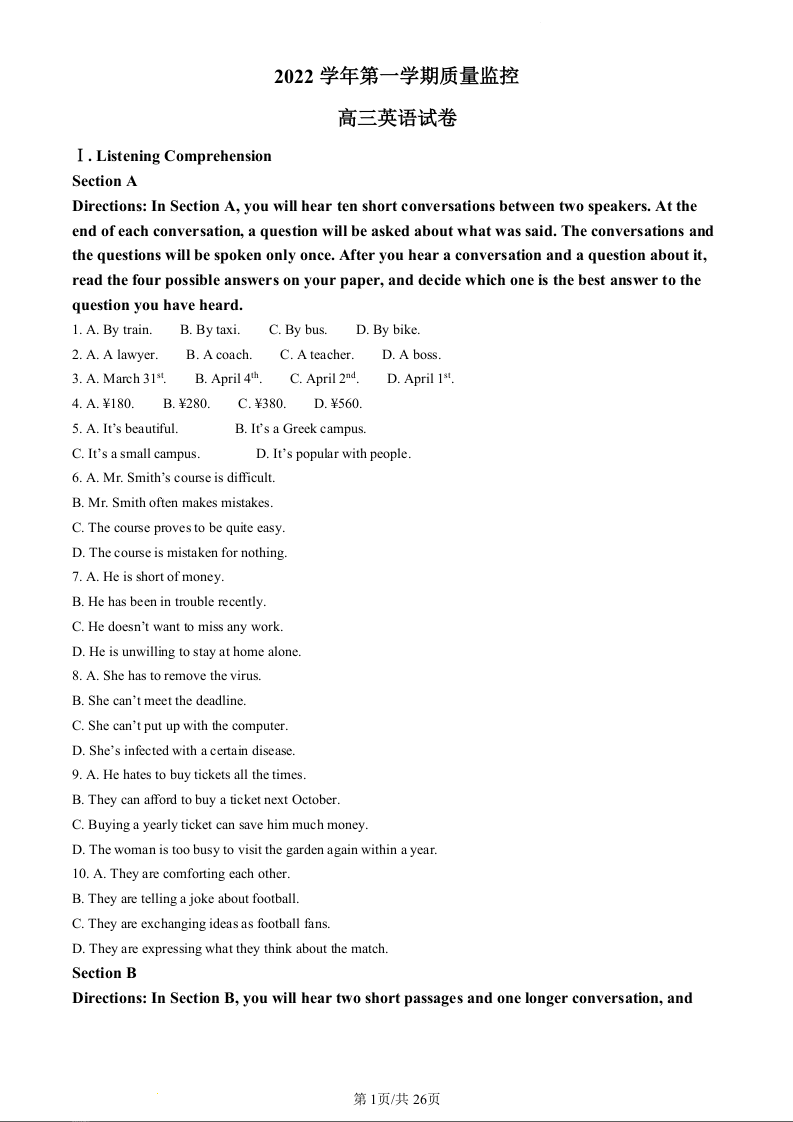 高三英语(解析版)--上海市金山区2023届高三上学期期末(暨一模)质量监控