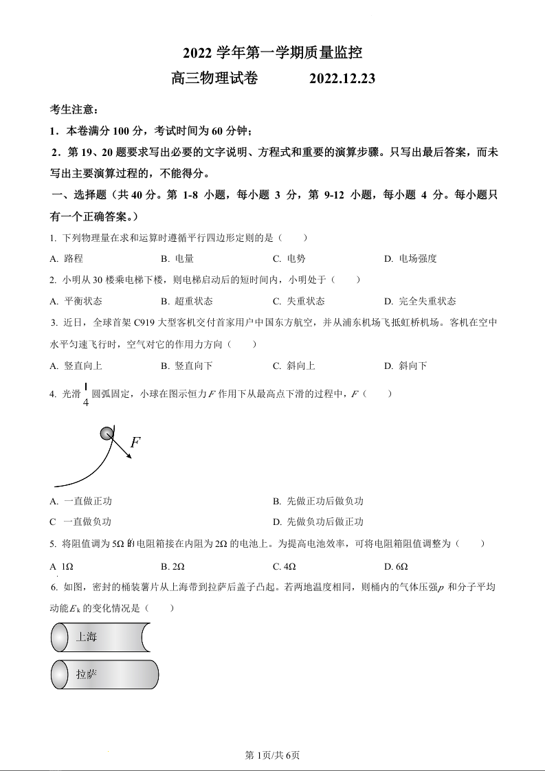 高三物理(原卷版)--上海市金山区2023届高三上学期期末(暨一模)质量监控