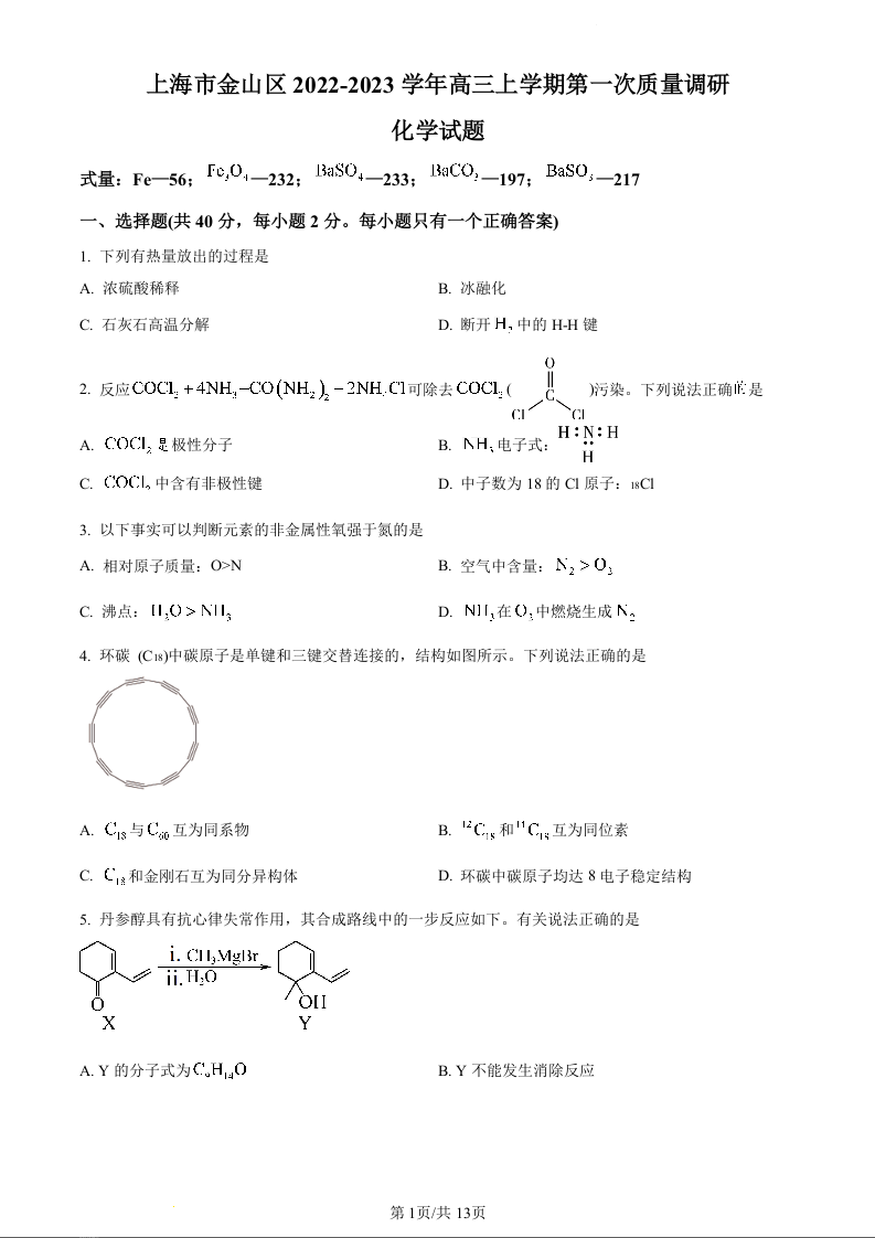 高三化学+答案--上海市金山区2023届高三上学期期末(暨一模)质量监控
