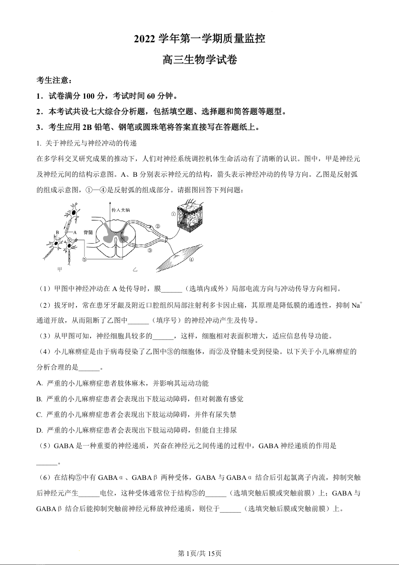 高三生物(解析版)--上海市金山区2023届高三上学期期末(暨一模)质量监控