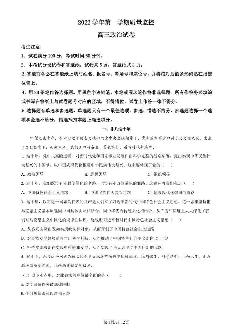 高三政治(解析版)--上海市金山区2023届高三上学期期末(暨一模)质量监控