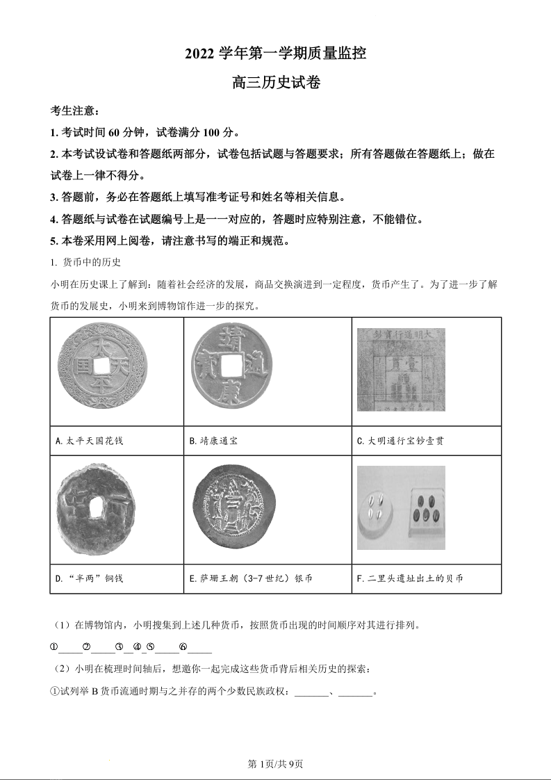 高三历史(原卷版)--上海市金山区2023届高三上学期期末(暨一模)质量监控