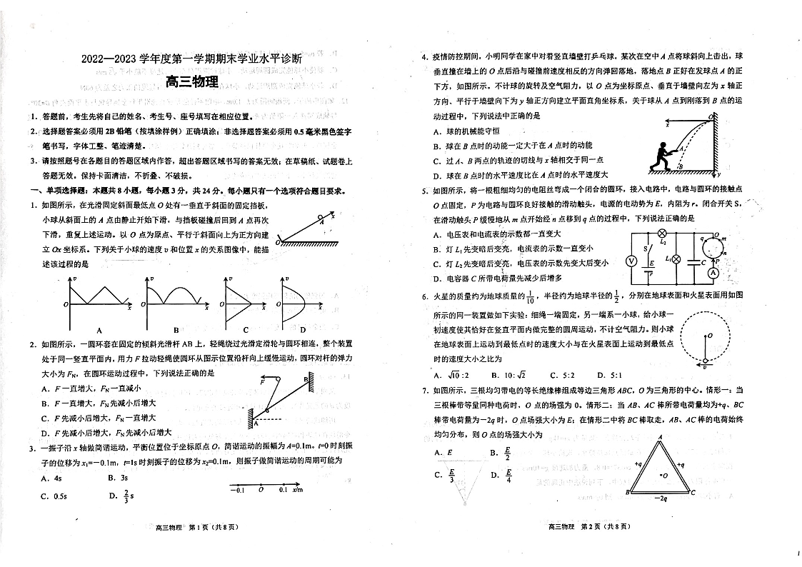 高三物理--山东烟台高三2022-2023学年度第一学期期末学业水平诊断