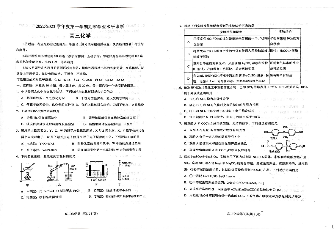 高三化学--山东烟台高三2022-2023学年度第一学期期末学业水平诊断