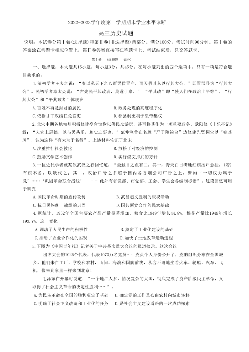 高三历史--山东烟台高三2022-2023学年度第一学期期末学业水平诊断