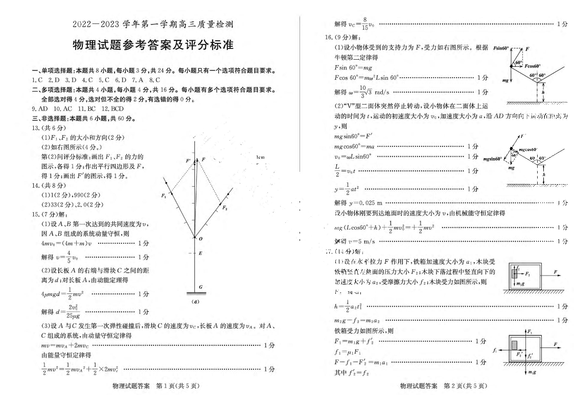 高三物理答案--山东省枣庄2022-2023学年第一学期高三质量检测(一调)