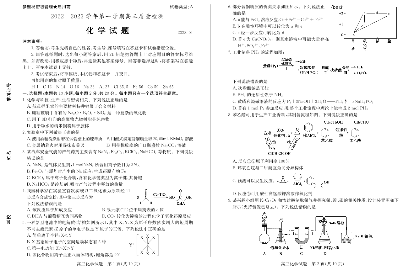 高三化学--山东省枣庄2022-2023学年第一学期高三质量检测(一调)
