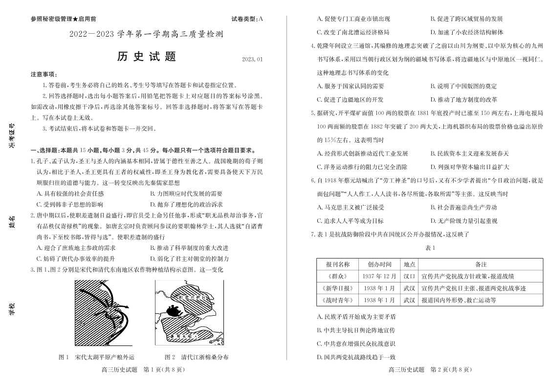 高三历史--山东省枣庄2022-2023学年第一学期高三质量检测(一调)
