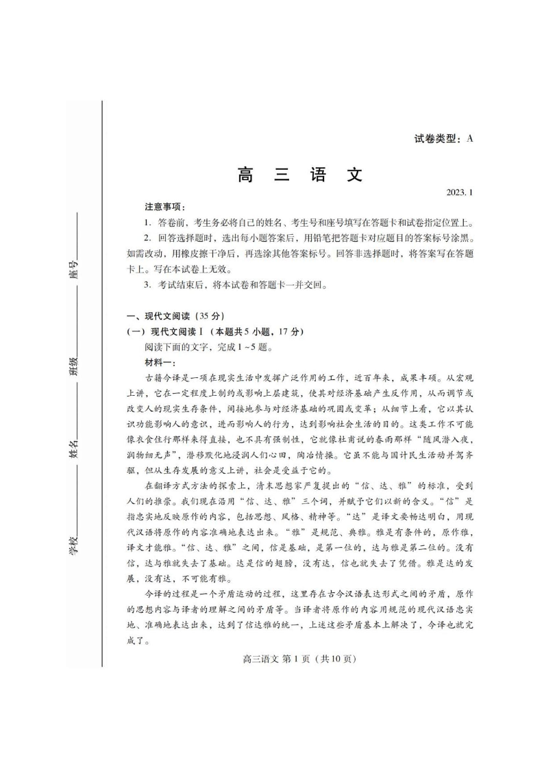 高三语文--山东省潍坊2023届高三期末联考